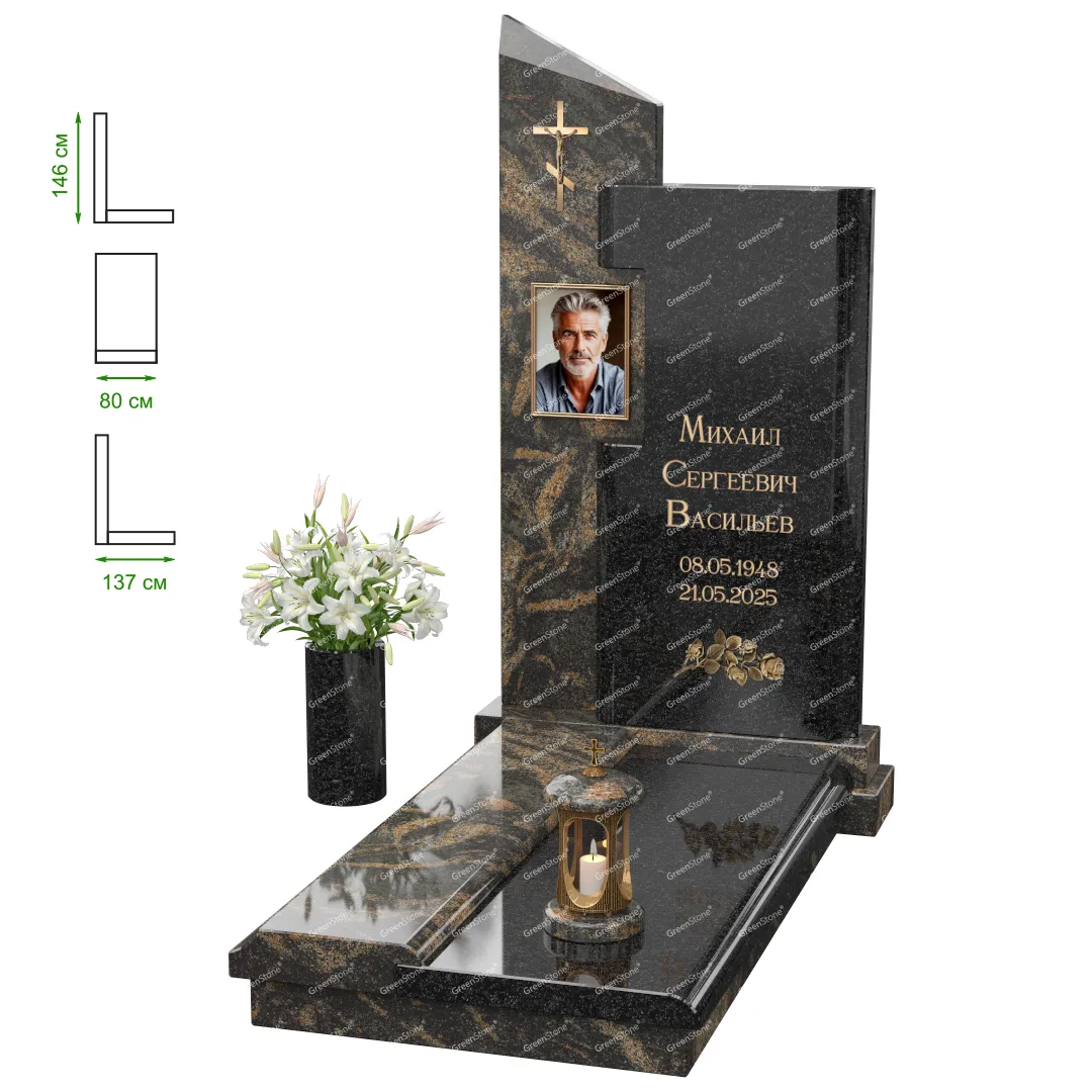Визуально комплекс отличается от типовой формы не только формой, но и размерами. Массивная стела позволяет дизайнеру реализовать практически любые задумки и пожелания Заказчика, придать готовому изделию солидный вид, раскрыть все достоинства использованного в его изготовлении гранита. Такой габаритный памятник требует профессиональной доставки и установки. Все это также можно заказать в мастерской Грин-Стоун.