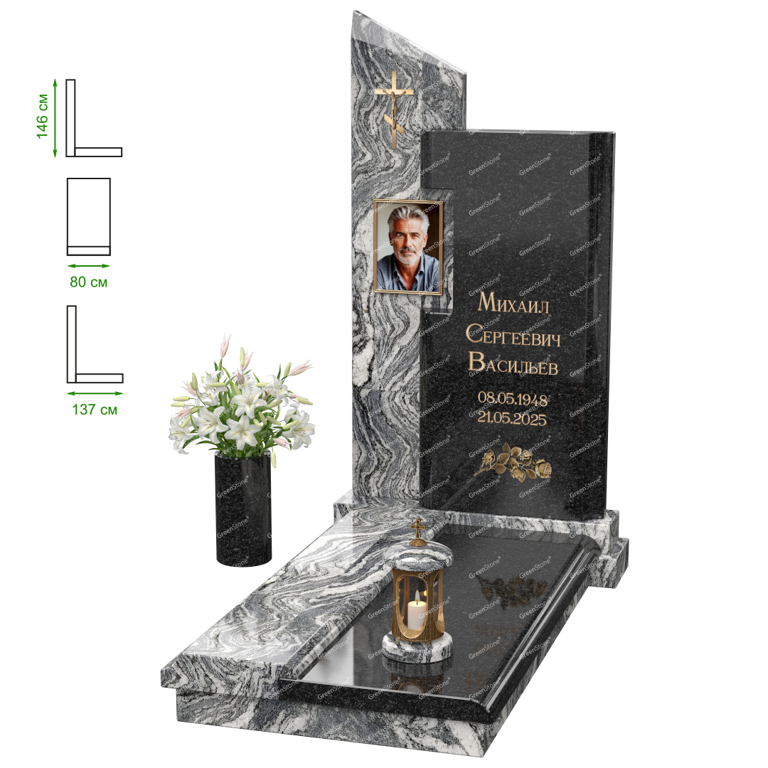 Визуально комплекс отличается от типовой формы не только формой, но и размерами. Массивная стела позволяет дизайнеру реализовать практически любые задумки и пожелания Заказчика, придать готовому изделию солидный вид, раскрыть все достоинства использованного в его изготовлении гранита. Такой габаритный памятник требует профессиональной доставки и установки. Все это также можно заказать в мастерской Грин-Стоун.