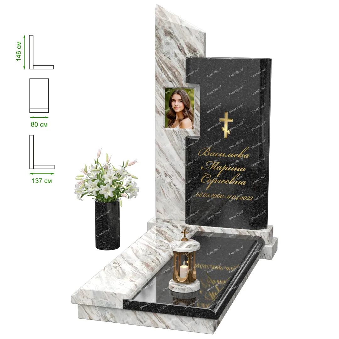Визуально комплекс отличается от типовой формы не только формой, но и размерами. Массивная стела позволяет дизайнеру реализовать практически любые задумки и пожелания Заказчика, придать готовому изделию солидный вид, раскрыть все достоинства использованного в его изготовлении гранита. Такой габаритный памятник требует профессиональной доставки и установки. Все это также можно заказать в мастерской Грин-Стоун.