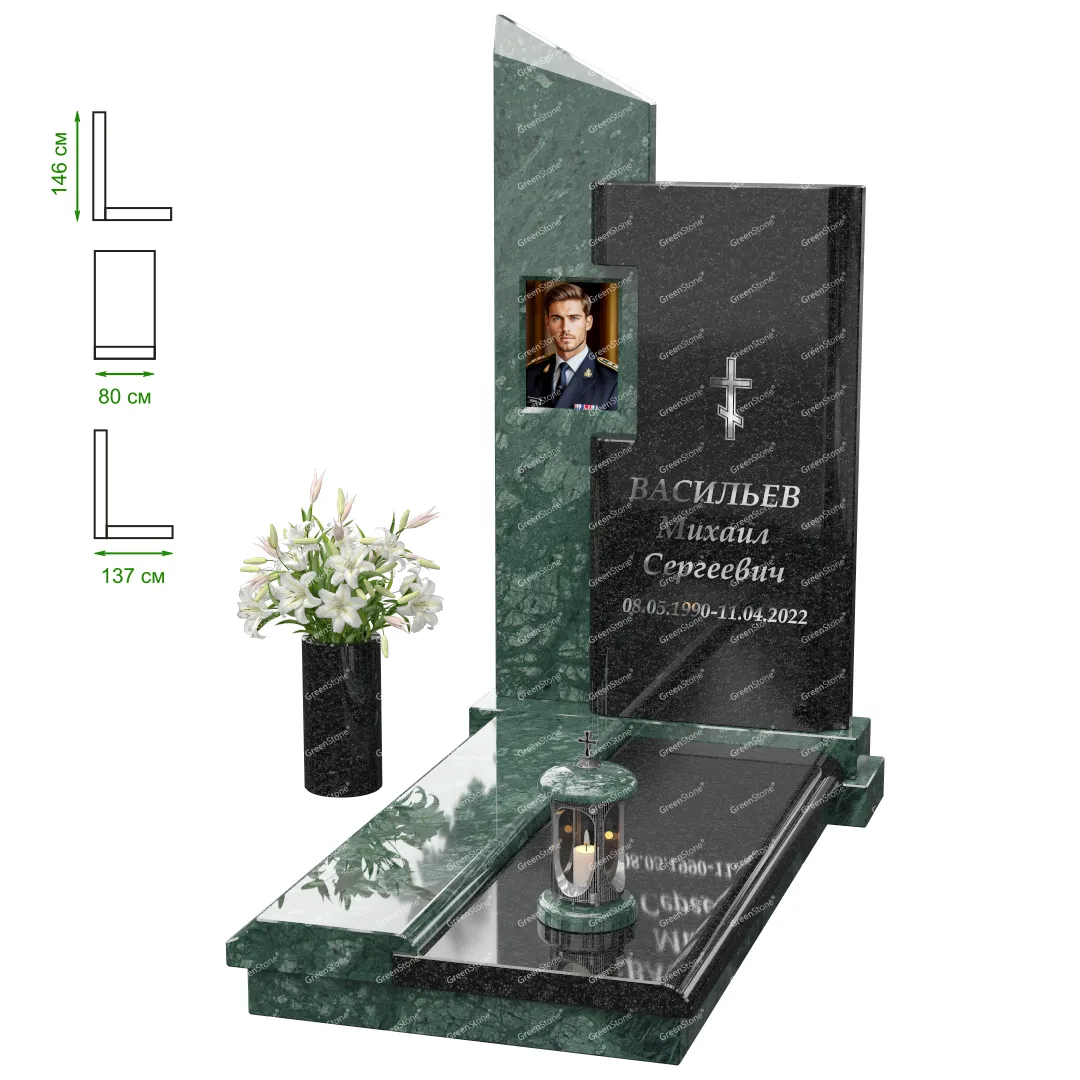 Визуально комплекс отличается от типовой формы не только формой, но и размерами. Массивная стела позволяет дизайнеру реализовать практически любые задумки и пожелания Заказчика, придать готовому изделию солидный вид, раскрыть все достоинства использованного в его изготовлении гранита. Такой габаритный памятник требует профессиональной доставки и установки. Все это также можно заказать в мастерской Грин-Стоун.
