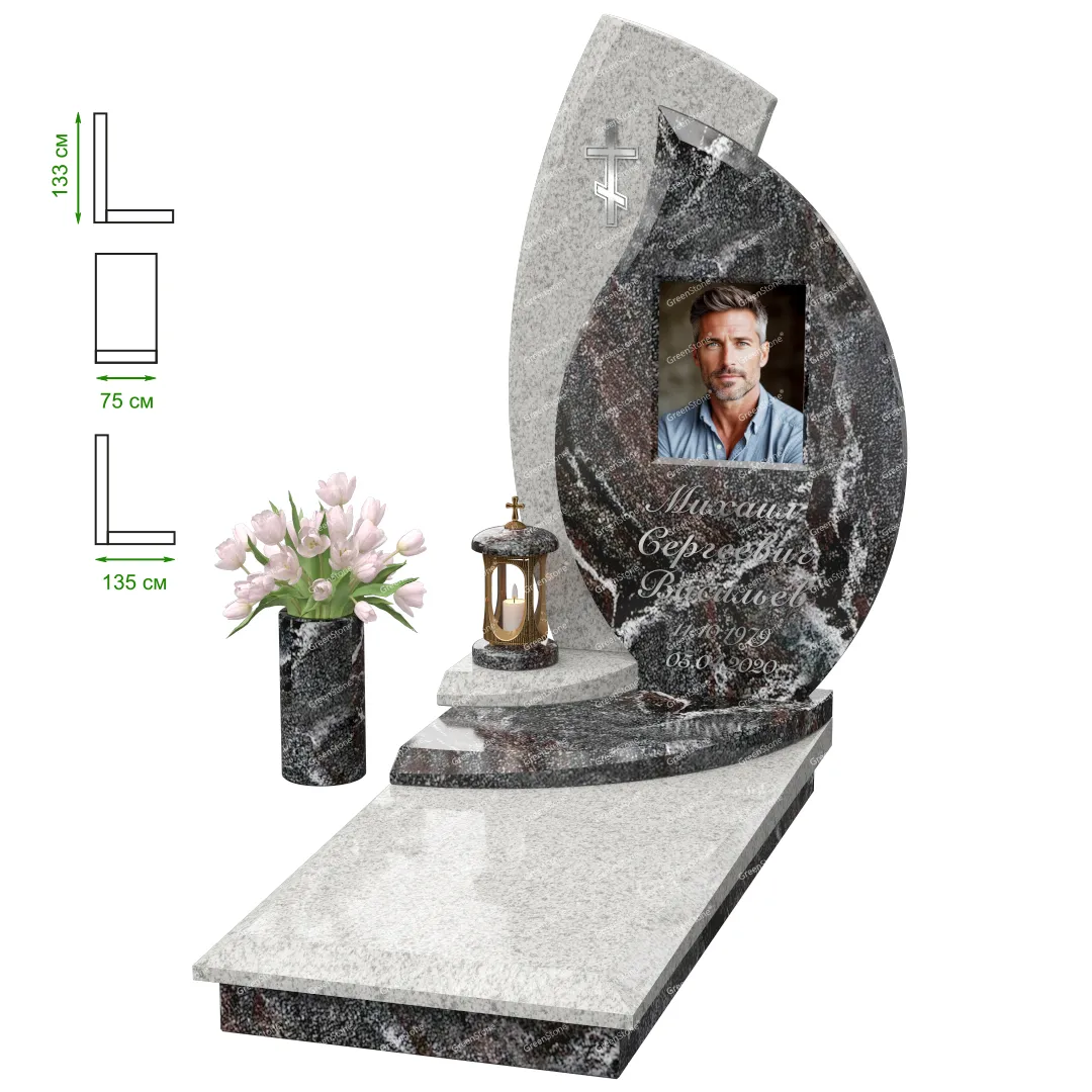 Визуально комплекс отличается от типовой формы не только формой, но и размерами. Массивная стела позволяет дизайнеру реализовать практически любые задумки и пожелания Заказчика, придать готовому изделию солидный вид, раскрыть все достоинства использованного в его изготовлении гранита. Такой габаритный памятник требует профессиональной доставки и установки. Все это также можно заказать в мастерской Грин-Стоун.