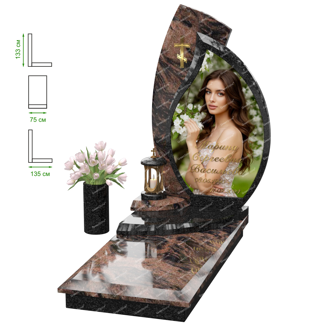 Визуально комплекс отличается от типовой формы не только формой, но и размерами. Массивная стела позволяет дизайнеру реализовать практически любые задумки и пожелания Заказчика, придать готовому изделию солидный вид, раскрыть все достоинства использованного в его изготовлении гранита. Такой габаритный памятник требует профессиональной доставки и установки. Все это также можно заказать в мастерской Грин-Стоун.