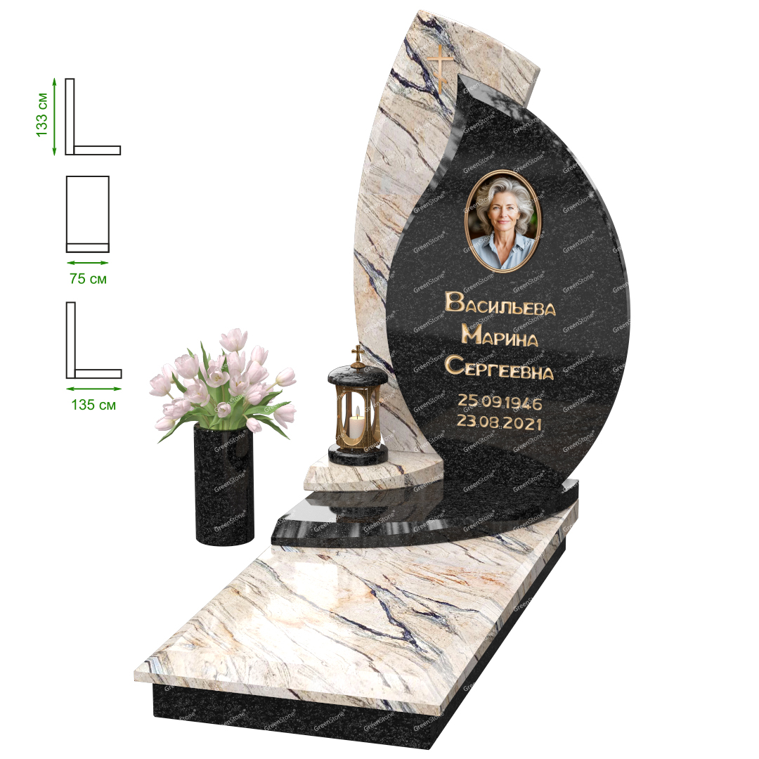 Визуально комплекс отличается от типовой формы не только формой, но и размерами. Массивная стела позволяет дизайнеру реализовать практически любые задумки и пожелания Заказчика, придать готовому изделию солидный вид, раскрыть все достоинства использованного в его изготовлении гранита. Такой габаритный памятник требует профессиональной доставки и установки. Все это также можно заказать в мастерской Грин-Стоун.