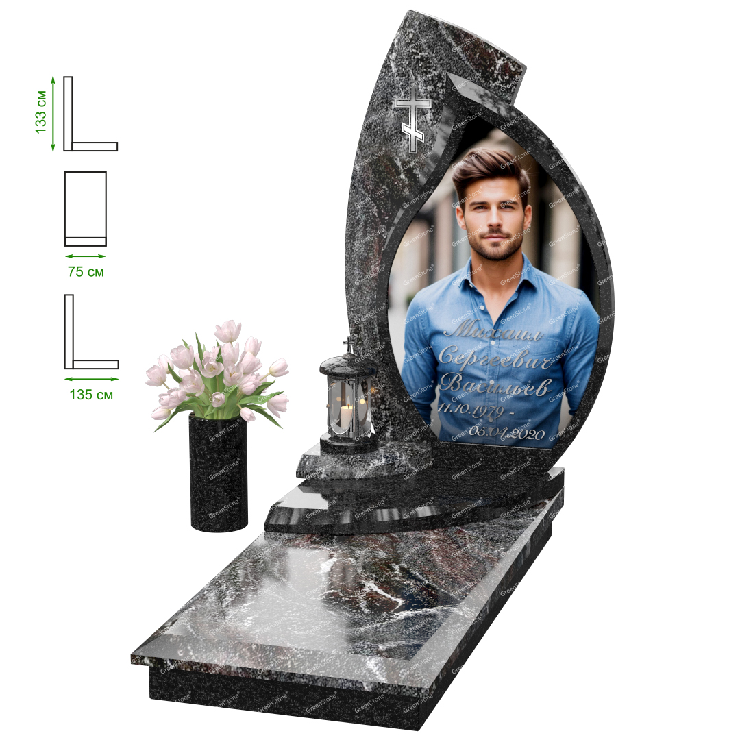 Визуально комплекс отличается от типовой формы не только формой, но и размерами. Массивная стела позволяет дизайнеру реализовать практически любые задумки и пожелания Заказчика, придать готовому изделию солидный вид, раскрыть все достоинства использованного в его изготовлении гранита. Такой габаритный памятник требует профессиональной доставки и установки. Все это также можно заказать в мастерской Грин-Стоун.