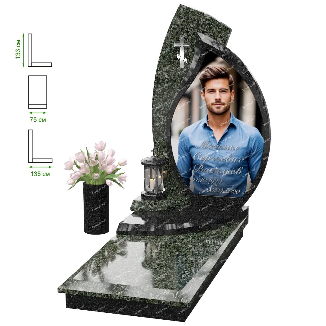 Визуально комплекс отличается от типовой формы не только формой, но и размерами. Массивная стела позволяет дизайнеру реализовать практически любые задумки и пожелания Заказчика, придать готовому изделию солидный вид, раскрыть все достоинства использованного в его изготовлении гранита. Такой габаритный памятник требует профессиональной доставки и установки. Все это также можно заказать в мастерской Грин-Стоун.
