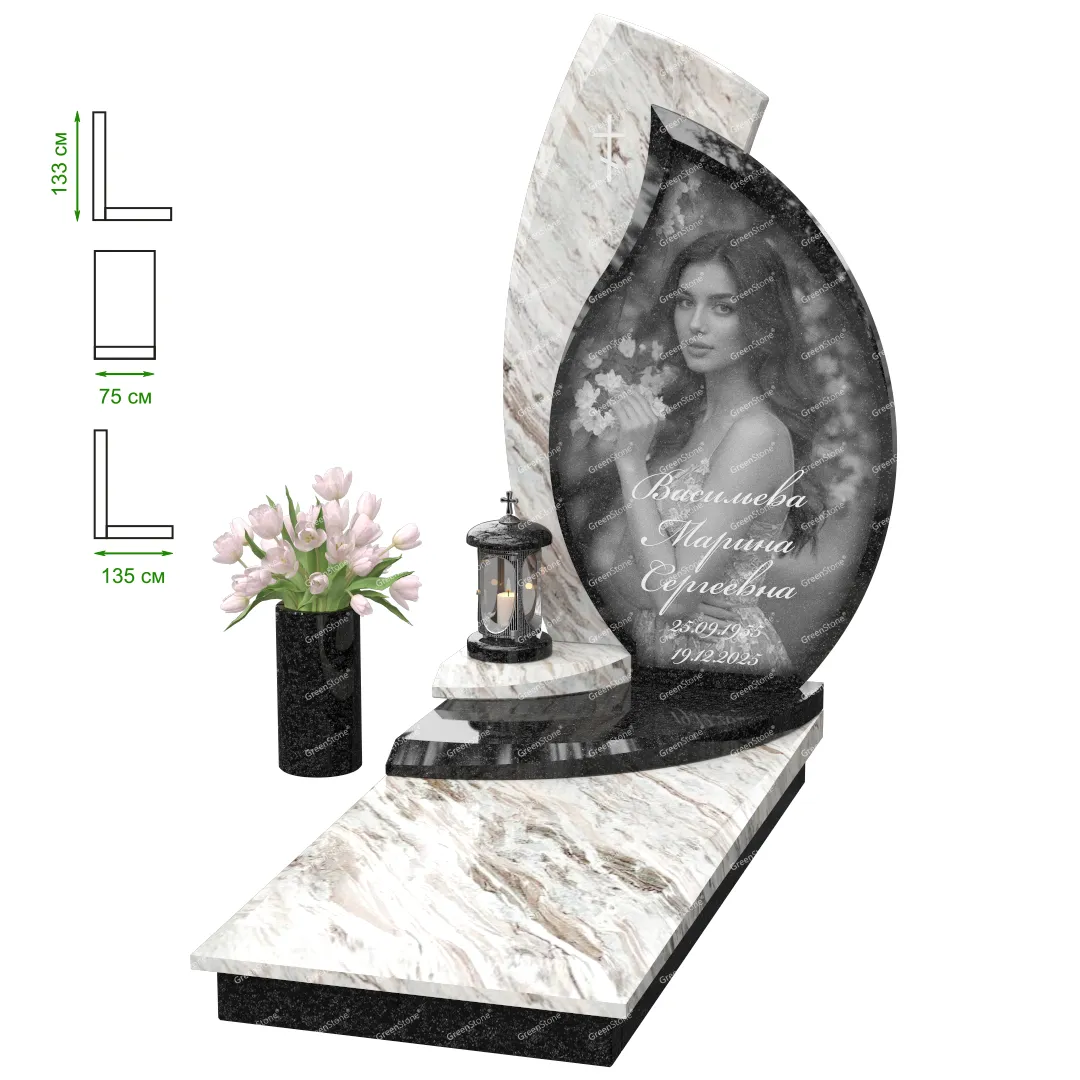 Визуально комплекс отличается от типовой формы не только формой, но и размерами. Массивная стела позволяет дизайнеру реализовать практически любые задумки и пожелания Заказчика, придать готовому изделию солидный вид, раскрыть все достоинства использованного в его изготовлении гранита. Такой габаритный памятник требует профессиональной доставки и установки. Все это также можно заказать в мастерской Грин-Стоун.