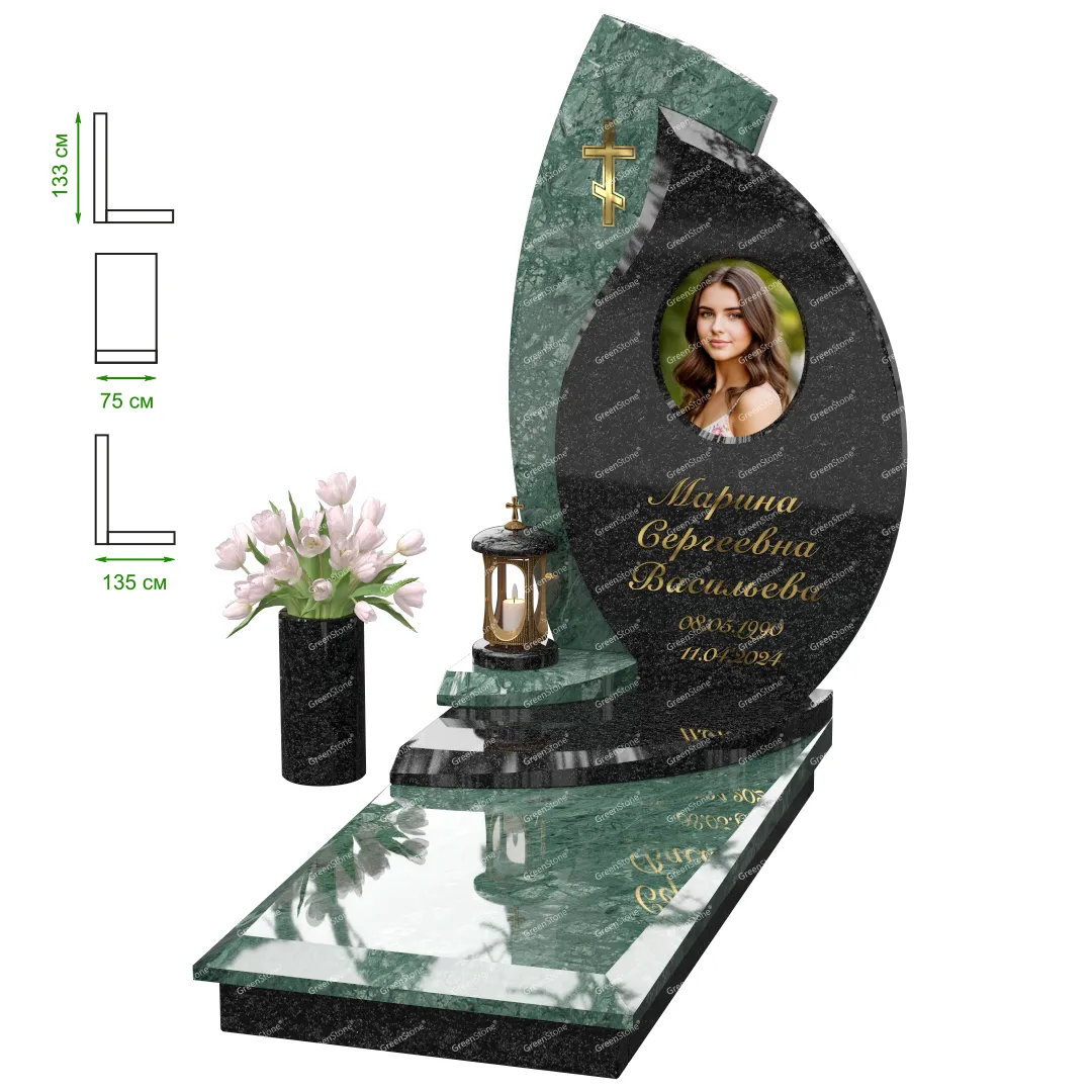 Визуально комплекс отличается от типовой формы не только формой, но и размерами. Массивная стела позволяет дизайнеру реализовать практически любые задумки и пожелания Заказчика, придать готовому изделию солидный вид, раскрыть все достоинства использованного в его изготовлении гранита. Такой габаритный памятник требует профессиональной доставки и установки. Все это также можно заказать в мастерской Грин-Стоун.