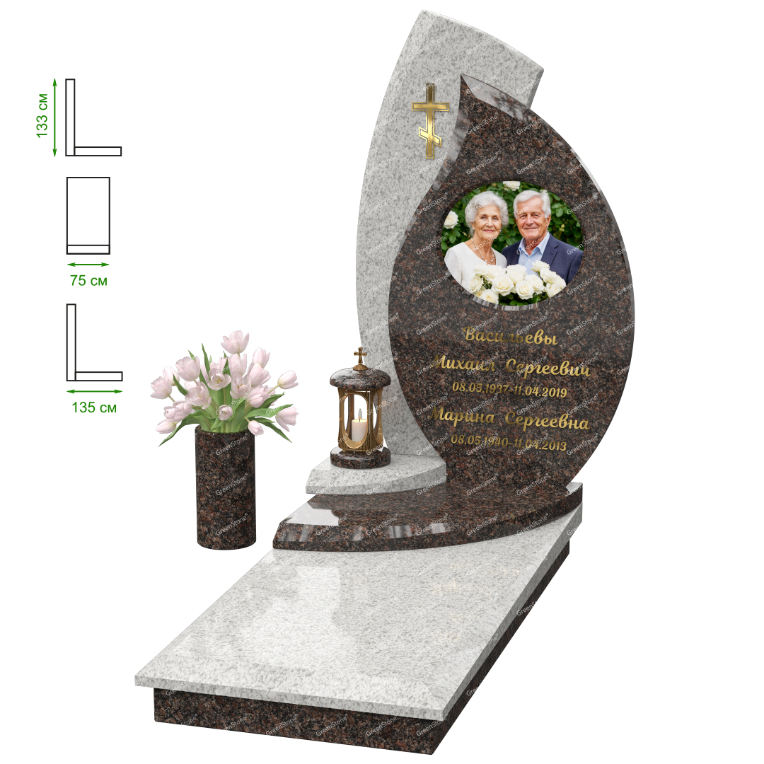 Визуально комплекс отличается от типовой формы не только формой, но и размерами. Массивная стела позволяет дизайнеру реализовать практически любые задумки и пожелания Заказчика, придать готовому изделию солидный вид, раскрыть все достоинства использованного в его изготовлении гранита. Такой габаритный памятник требует профессиональной доставки и установки. Все это также можно заказать в мастерской Грин-Стоун.