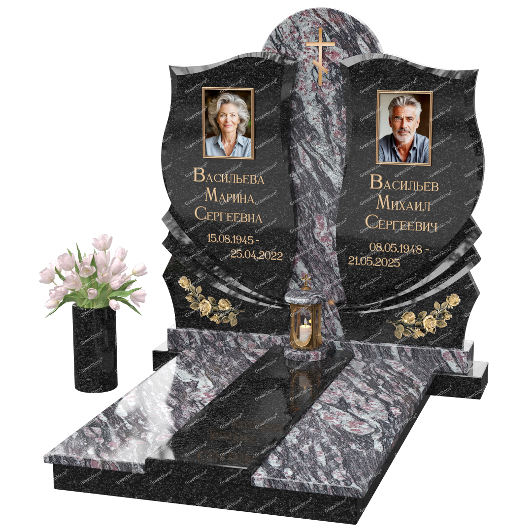 Визуально комплекс отличается от типовой формы не только формой, но и размерами. Массивная стела позволяет дизайнеру реализовать практически любые задумки и пожелания Заказчика, придать готовому изделию солидный вид, раскрыть все достоинства использованного в его изготовлении гранита. Такой габаритный памятник требует профессиональной доставки и установки. Все это также можно заказать в мастерской Грин-Стоун.
