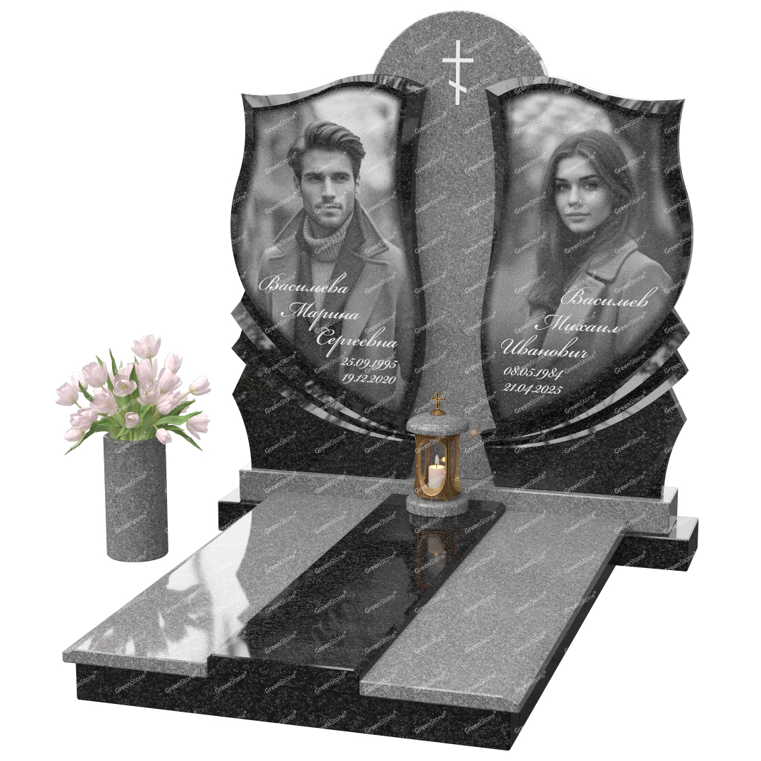 Визуально комплекс отличается от типовой формы не только формой, но и размерами. Массивная стела позволяет дизайнеру реализовать практически любые задумки и пожелания Заказчика, придать готовому изделию солидный вид, раскрыть все достоинства использованного в его изготовлении гранита. Такой габаритный памятник требует профессиональной доставки и установки. Все это также можно заказать в мастерской Грин-Стоун.