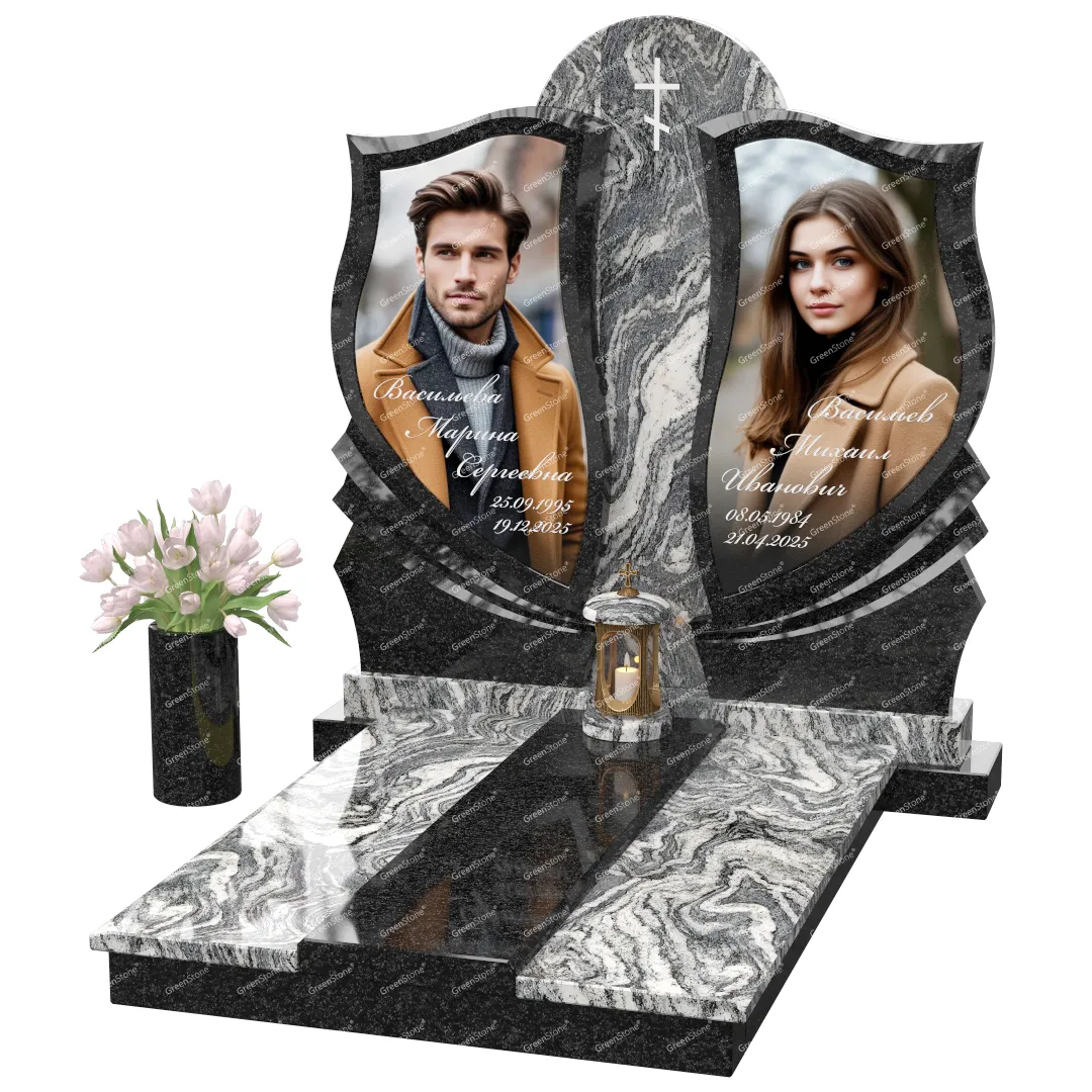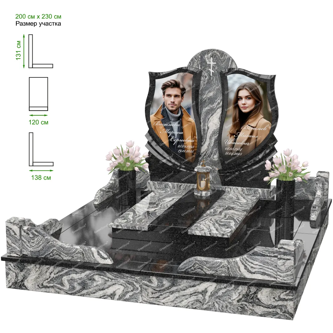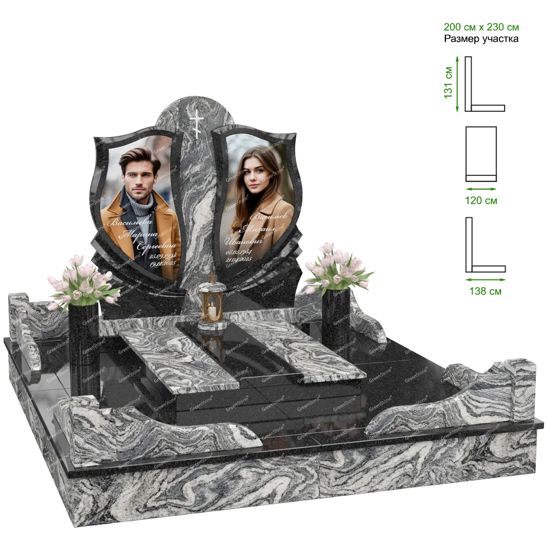 Визуально комплекс отличается от типовой формы не только формой, но и размерами. Массивная стела позволяет дизайнеру реализовать практически любые задумки и пожелания Заказчика, придать готовому изделию солидный вид, раскрыть все достоинства использованного в его изготовлении гранита. Такой габаритный памятник требует профессиональной доставки и установки. Все это также можно заказать в мастерской Грин-Стоун.
