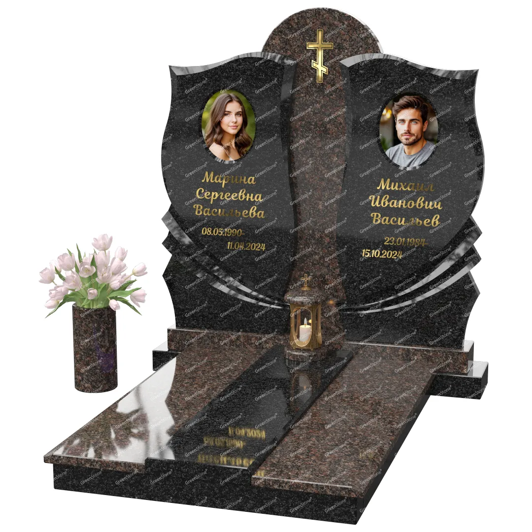 Визуально комплекс отличается от типовой формы не только формой, но и размерами. Массивная стела позволяет дизайнеру реализовать практически любые задумки и пожелания Заказчика, придать готовому изделию солидный вид, раскрыть все достоинства использованного в его изготовлении гранита. Такой габаритный памятник требует профессиональной доставки и установки. Все это также можно заказать в мастерской Грин-Стоун.