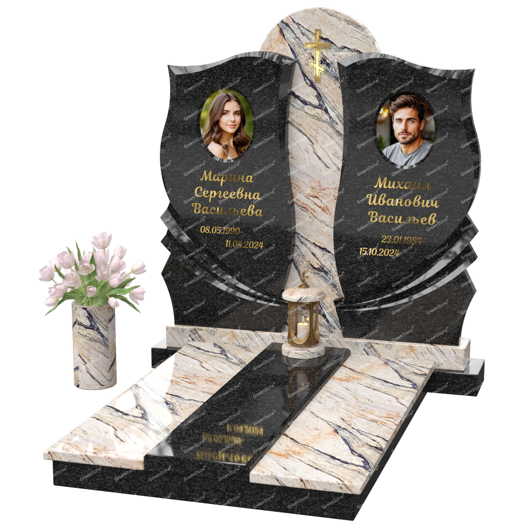 Визуально комплекс отличается от типовой формы не только формой, но и размерами. Массивная стела позволяет дизайнеру реализовать практически любые задумки и пожелания Заказчика, придать готовому изделию солидный вид, раскрыть все достоинства использованного в его изготовлении гранита. Такой габаритный памятник требует профессиональной доставки и установки. Все это также можно заказать в мастерской Грин-Стоун.