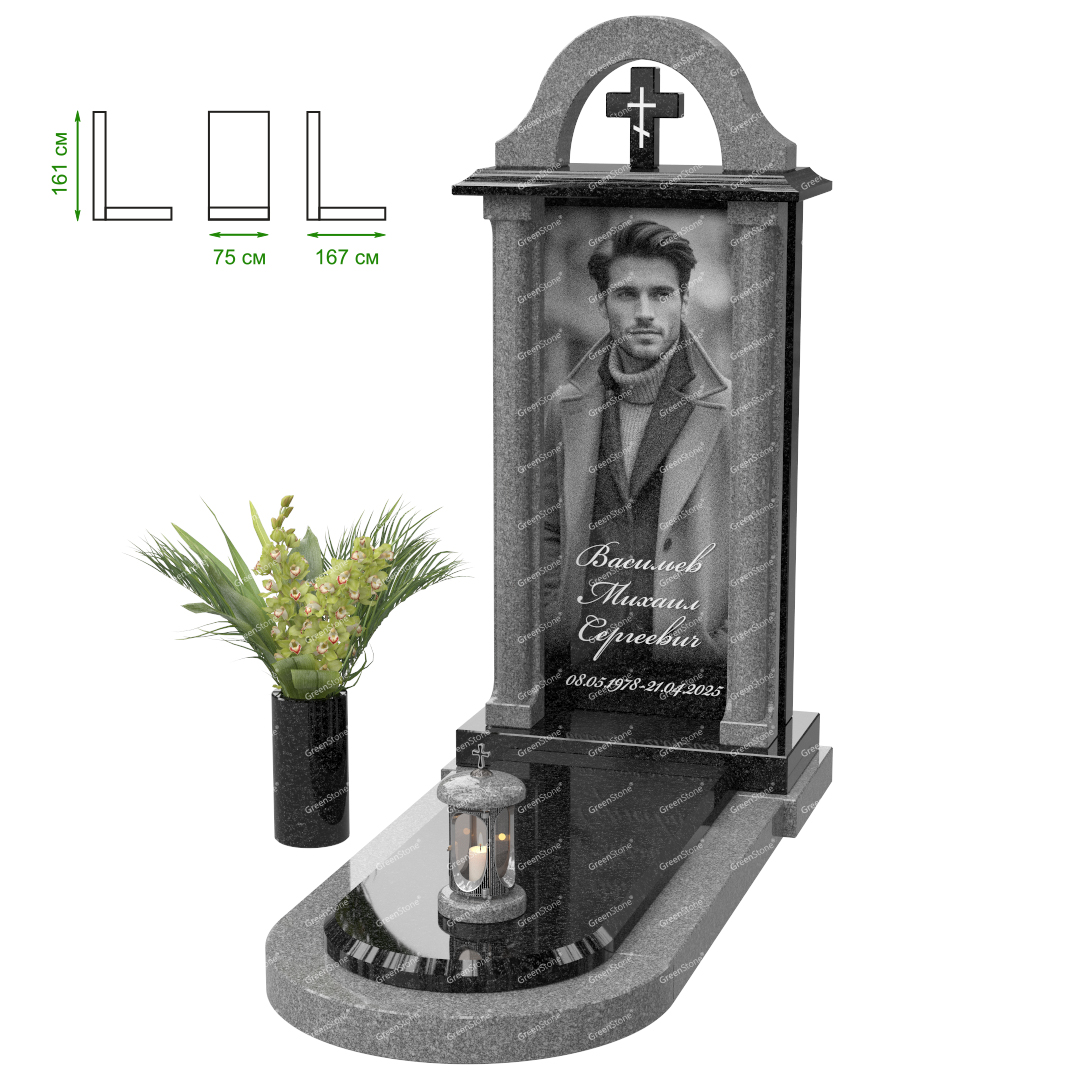 Визуально комплекс отличается от типовой формы не только формой, но и размерами. Массивная стела позволяет дизайнеру реализовать практически любые задумки и пожелания Заказчика, придать готовому изделию солидный вид, раскрыть все достоинства использованного в его изготовлении гранита. Такой габаритный памятник требует профессиональной доставки и установки. Все это также можно заказать в мастерской Грин-Стоун.