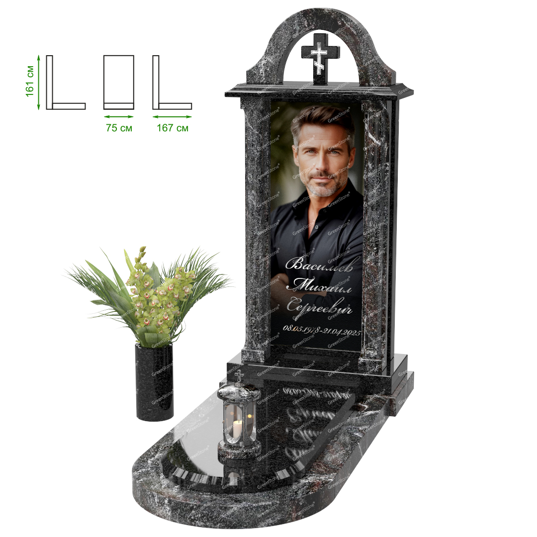 Визуально комплекс отличается от типовой формы не только формой, но и размерами. Массивная стела позволяет дизайнеру реализовать практически любые задумки и пожелания Заказчика, придать готовому изделию солидный вид, раскрыть все достоинства использованного в его изготовлении гранита. Такой габаритный памятник требует профессиональной доставки и установки. Все это также можно заказать в мастерской Грин-Стоун.