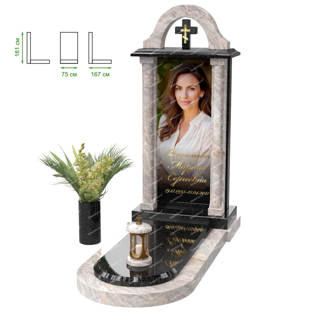 Визуально комплекс отличается от типовой формы не только формой, но и размерами. Массивная стела позволяет дизайнеру реализовать практически любые задумки и пожелания Заказчика, придать готовому изделию солидный вид, раскрыть все достоинства использованного в его изготовлении гранита. Такой габаритный памятник требует профессиональной доставки и установки. Все это также можно заказать в мастерской Грин-Стоун.