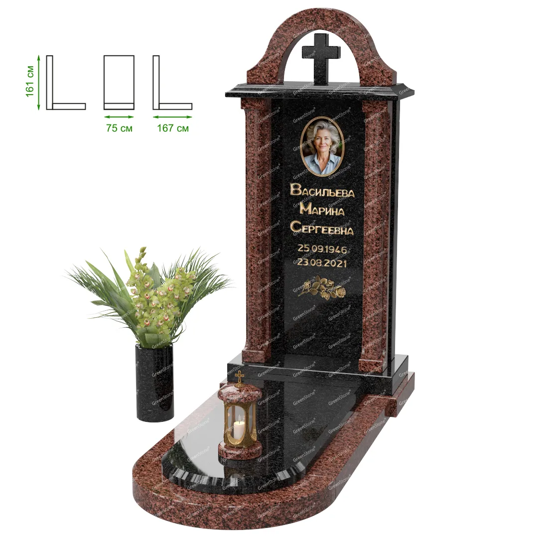 Визуально комплекс отличается от типовой формы не только формой, но и размерами. Массивная стела позволяет дизайнеру реализовать практически любые задумки и пожелания Заказчика, придать готовому изделию солидный вид, раскрыть все достоинства использованного в его изготовлении гранита. Такой габаритный памятник требует профессиональной доставки и установки. Все это также можно заказать в мастерской Грин-Стоун.