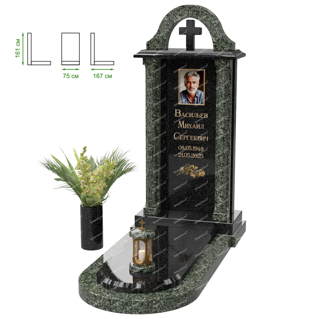 Визуально комплекс отличается от типовой формы не только формой, но и размерами. Массивная стела позволяет дизайнеру реализовать практически любые задумки и пожелания Заказчика, придать готовому изделию солидный вид, раскрыть все достоинства использованного в его изготовлении гранита. Такой габаритный памятник требует профессиональной доставки и установки. Все это также можно заказать в мастерской Грин-Стоун.