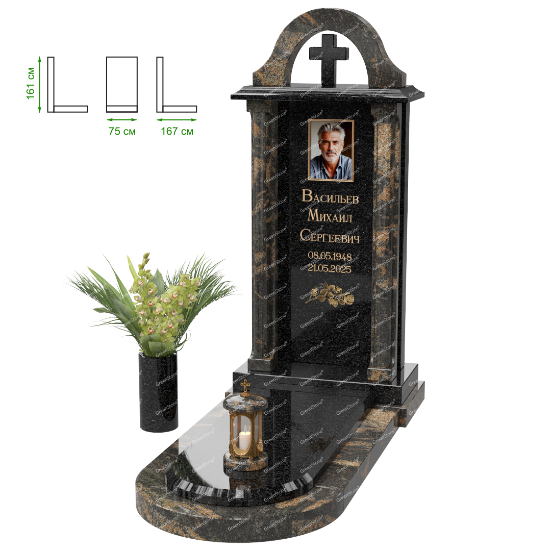 Визуально комплекс отличается от типовой формы не только формой, но и размерами. Массивная стела позволяет дизайнеру реализовать практически любые задумки и пожелания Заказчика, придать готовому изделию солидный вид, раскрыть все достоинства использованного в его изготовлении гранита. Такой габаритный памятник требует профессиональной доставки и установки. Все это также можно заказать в мастерской Грин-Стоун.