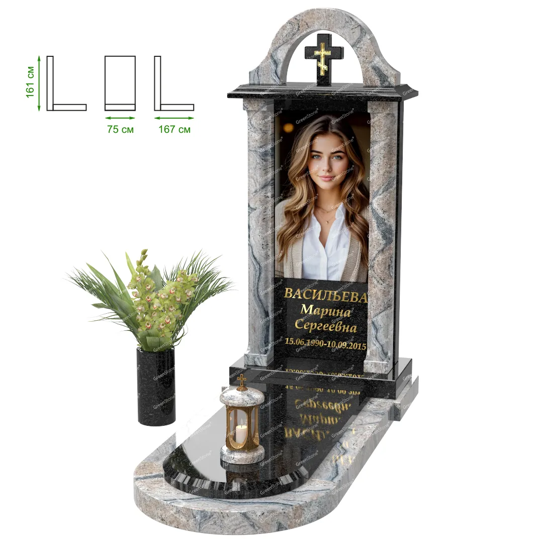 Визуально комплекс отличается от типовой формы не только формой, но и размерами. Массивная стела позволяет дизайнеру реализовать практически любые задумки и пожелания Заказчика, придать готовому изделию солидный вид, раскрыть все достоинства использованного в его изготовлении гранита. Такой габаритный памятник требует профессиональной доставки и установки. Все это также можно заказать в мастерской Грин-Стоун.
