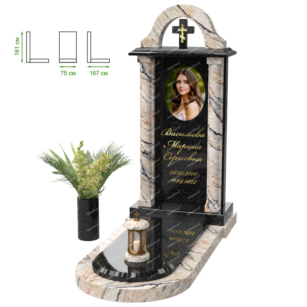 Визуально комплекс отличается от типовой формы не только формой, но и размерами. Массивная стела позволяет дизайнеру реализовать практически любые задумки и пожелания Заказчика, придать готовому изделию солидный вид, раскрыть все достоинства использованного в его изготовлении гранита. Такой габаритный памятник требует профессиональной доставки и установки. Все это также можно заказать в мастерской Грин-Стоун.