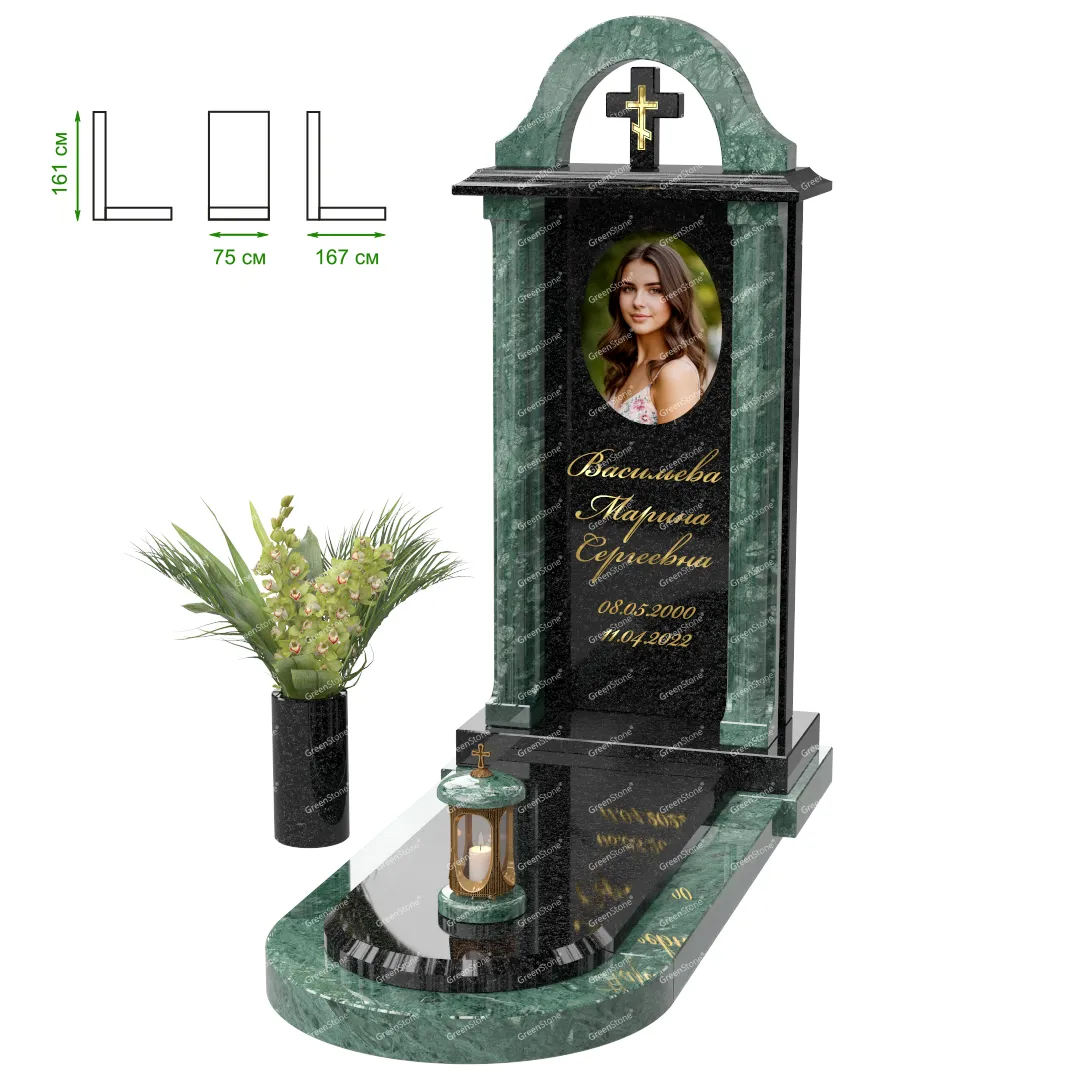 Визуально комплекс отличается от типовой формы не только формой, но и размерами. Массивная стела позволяет дизайнеру реализовать практически любые задумки и пожелания Заказчика, придать готовому изделию солидный вид, раскрыть все достоинства использованного в его изготовлении гранита. Такой габаритный памятник требует профессиональной доставки и установки. Все это также можно заказать в мастерской Грин-Стоун.