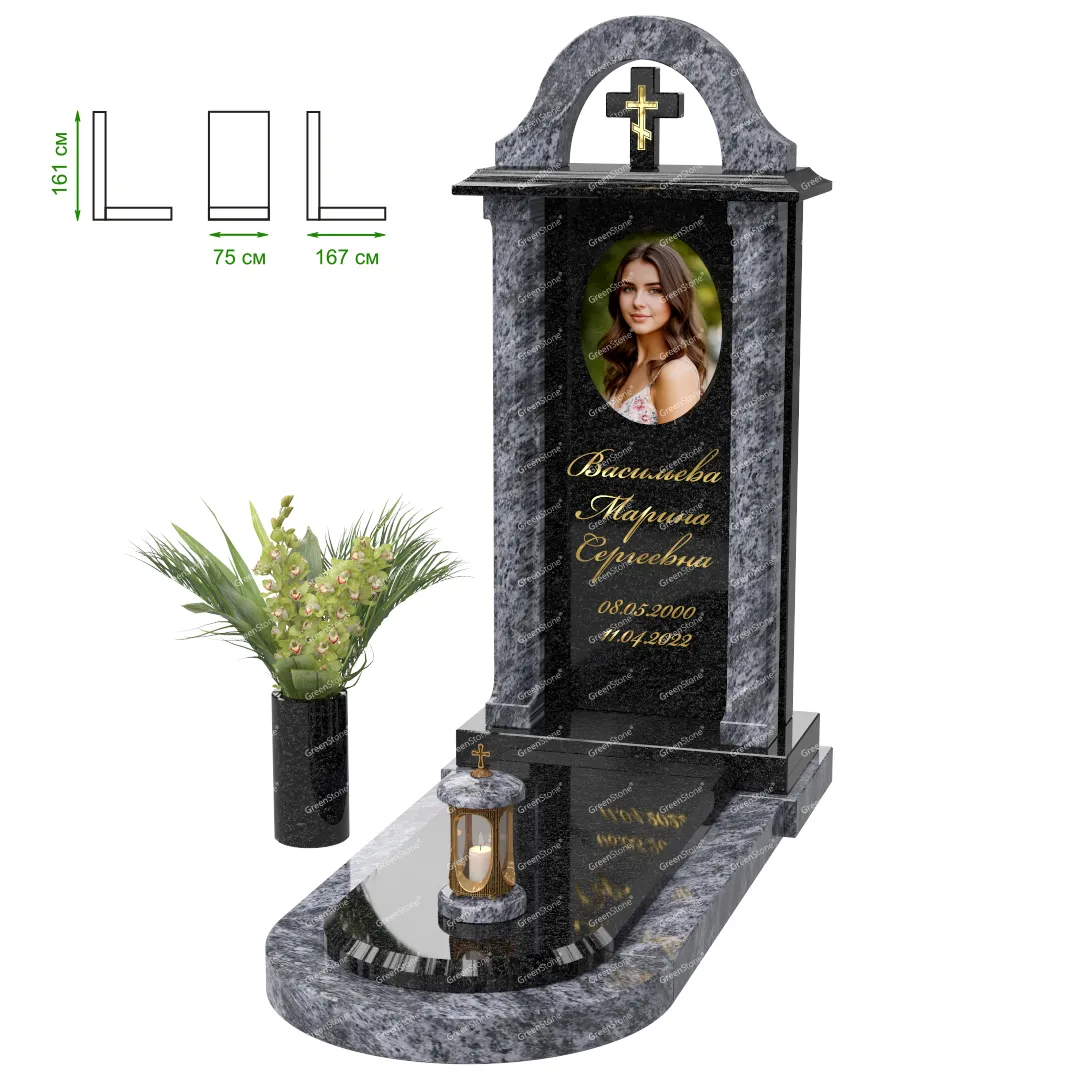 Визуально комплекс отличается от типовой формы не только формой, но и размерами. Массивная стела позволяет дизайнеру реализовать практически любые задумки и пожелания Заказчика, придать готовому изделию солидный вид, раскрыть все достоинства использованного в его изготовлении гранита. Такой габаритный памятник требует профессиональной доставки и установки. Все это также можно заказать в мастерской Грин-Стоун.