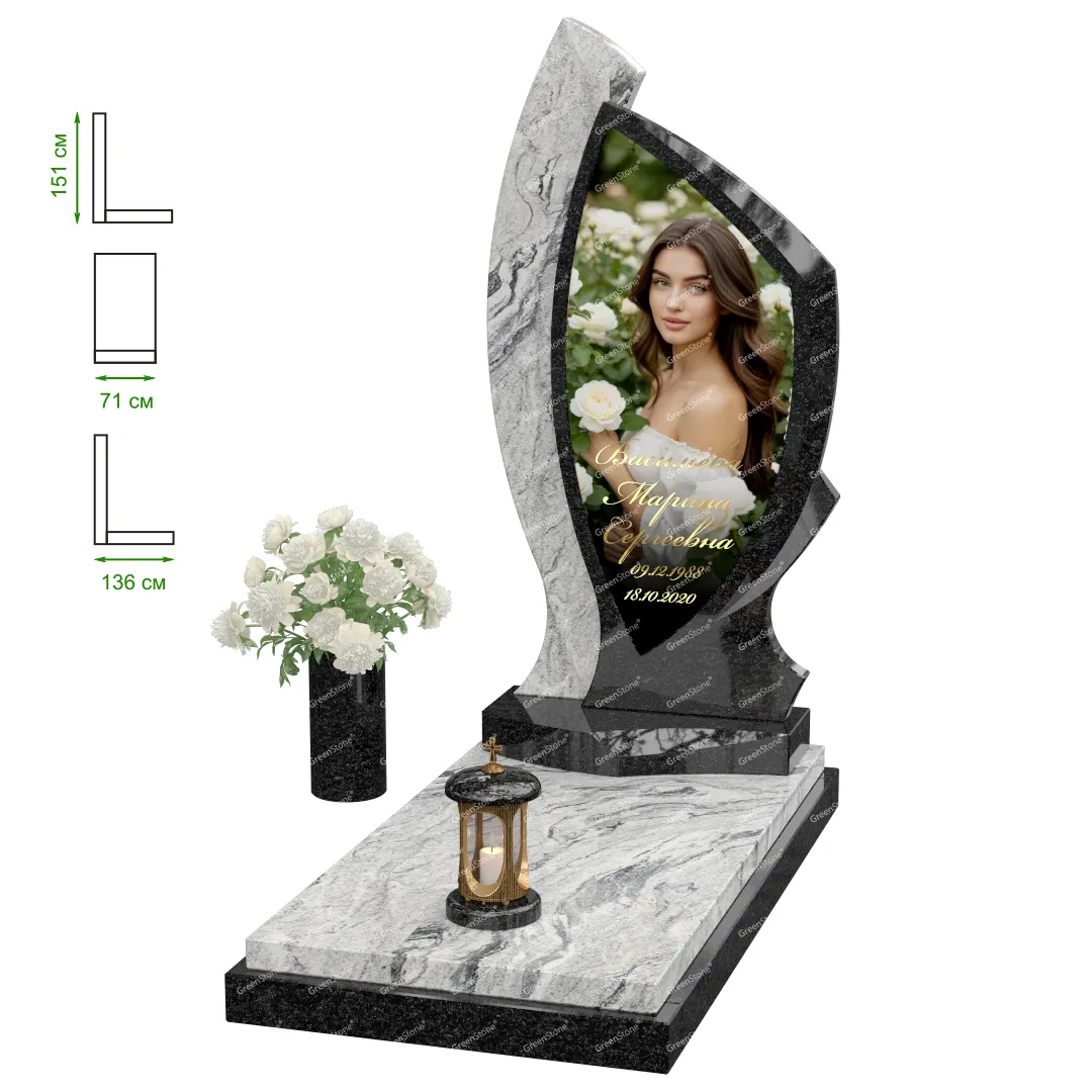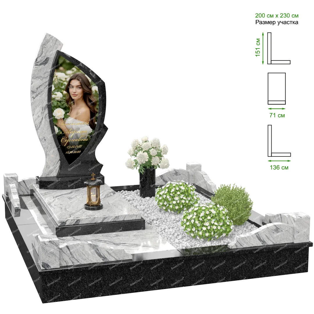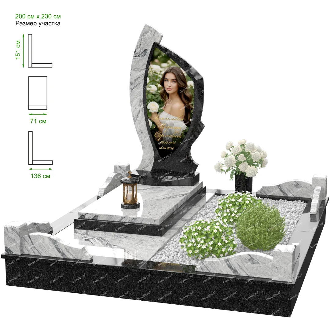 Визуально комплекс отличается от типовой формы не только формой, но и размерами. Массивная стела позволяет дизайнеру реализовать практически любые задумки и пожелания Заказчика, придать готовому изделию солидный вид, раскрыть все достоинства использованного в его изготовлении гранита. Такой габаритный памятник требует профессиональной доставки и установки. Все это также можно заказать в мастерской Грин-Стоун.