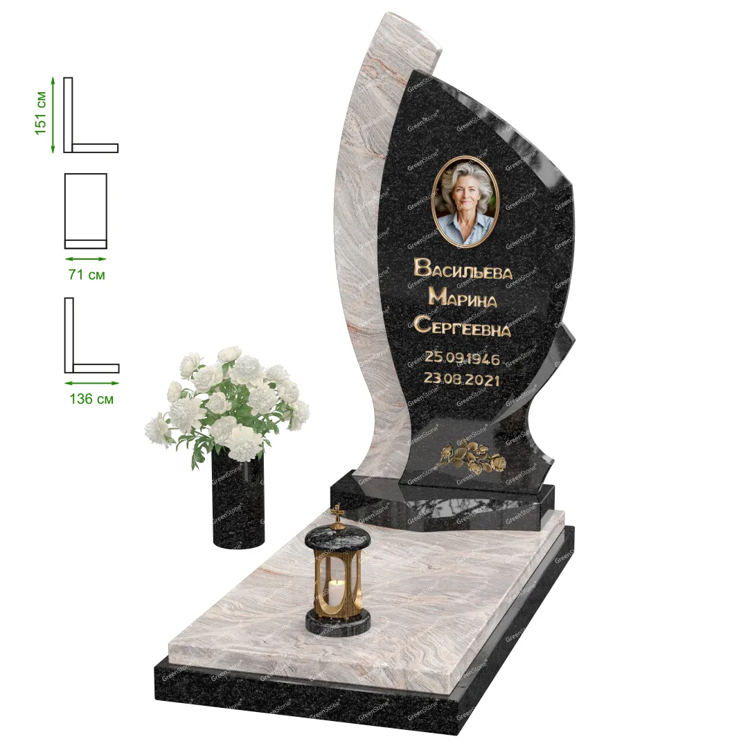Визуально комплекс отличается от типовой формы не только формой, но и размерами. Массивная стела позволяет дизайнеру реализовать практически любые задумки и пожелания Заказчика, придать готовому изделию солидный вид, раскрыть все достоинства использованного в его изготовлении гранита. Такой габаритный памятник требует профессиональной доставки и установки. Все это также можно заказать в мастерской Грин-Стоун.