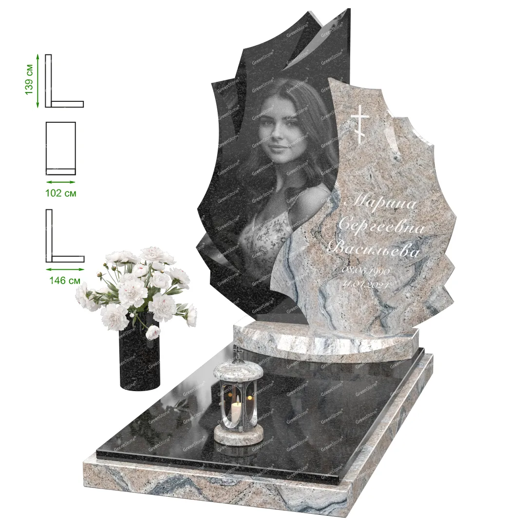Визуально комплекс отличается от типовой формы не только формой, но и размерами. Массивная стела позволяет дизайнеру реализовать практически любые задумки и пожелания Заказчика, придать готовому изделию солидный вид, раскрыть все достоинства использованного в его изготовлении гранита. Такой габаритный памятник требует профессиональной доставки и установки. Все это также можно заказать в мастерской Грин-Стоун.