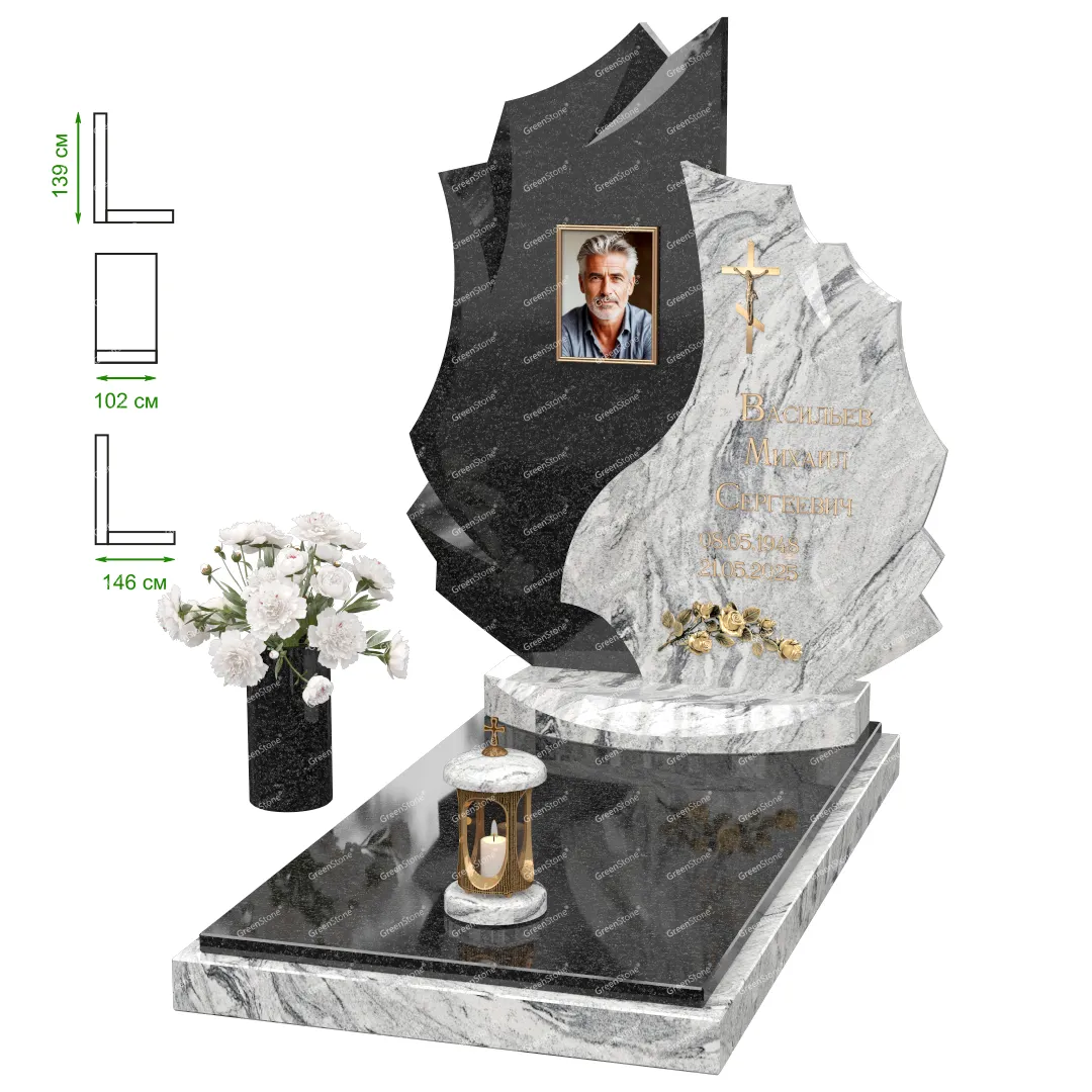 Визуально комплекс отличается от типовой формы не только формой, но и размерами. Массивная стела позволяет дизайнеру реализовать практически любые задумки и пожелания Заказчика, придать готовому изделию солидный вид, раскрыть все достоинства использованного в его изготовлении гранита. Такой габаритный памятник требует профессиональной доставки и установки. Все это также можно заказать в мастерской Грин-Стоун.