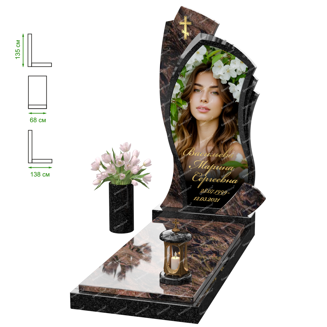 Визуально комплекс отличается от типовой формы не только формой, но и размерами. Массивная стела позволяет дизайнеру реализовать практически любые задумки и пожелания Заказчика, придать готовому изделию солидный вид, раскрыть все достоинства использованного в его изготовлении гранита. Такой габаритный памятник требует профессиональной доставки и установки. Все это также можно заказать в мастерской Грин-Стоун.