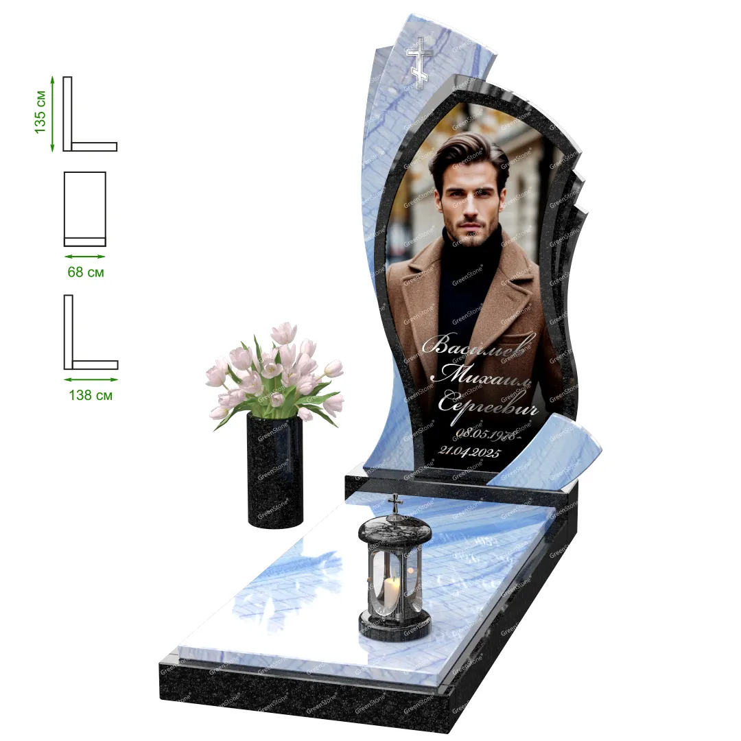 Визуально комплекс отличается от типовой формы не только формой, но и размерами. Массивная стела позволяет дизайнеру реализовать практически любые задумки и пожелания Заказчика, придать готовому изделию солидный вид, раскрыть все достоинства использованного в его изготовлении гранита. Такой габаритный памятник требует профессиональной доставки и установки. Все это также можно заказать в мастерской Грин-Стоун.