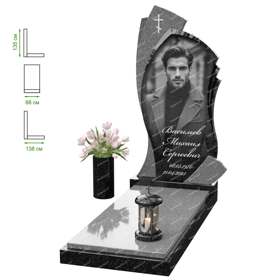 Визуально комплекс отличается от типовой формы не только формой, но и размерами. Массивная стела позволяет дизайнеру реализовать практически любые задумки и пожелания Заказчика, придать готовому изделию солидный вид, раскрыть все достоинства использованного в его изготовлении гранита. Такой габаритный памятник требует профессиональной доставки и установки. Все это также можно заказать в мастерской Грин-Стоун.