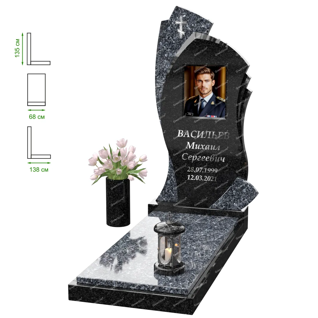 Визуально комплекс отличается от типовой формы не только формой, но и размерами. Массивная стела позволяет дизайнеру реализовать практически любые задумки и пожелания Заказчика, придать готовому изделию солидный вид, раскрыть все достоинства использованного в его изготовлении гранита. Такой габаритный памятник требует профессиональной доставки и установки. Все это также можно заказать в мастерской Грин-Стоун.