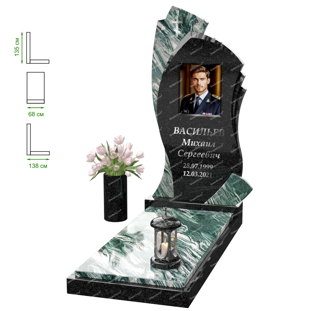 Визуально комплекс отличается от типовой формы не только формой, но и размерами. Массивная стела позволяет дизайнеру реализовать практически любые задумки и пожелания Заказчика, придать готовому изделию солидный вид, раскрыть все достоинства использованного в его изготовлении гранита. Такой габаритный памятник требует профессиональной доставки и установки. Все это также можно заказать в мастерской Грин-Стоун.