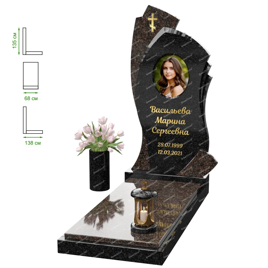 Визуально комплекс отличается от типовой формы не только формой, но и размерами. Массивная стела позволяет дизайнеру реализовать практически любые задумки и пожелания Заказчика, придать готовому изделию солидный вид, раскрыть все достоинства использованного в его изготовлении гранита. Такой габаритный памятник требует профессиональной доставки и установки. Все это также можно заказать в мастерской Грин-Стоун.