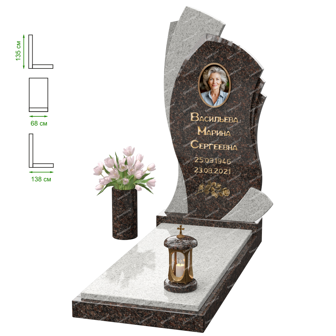 Визуально комплекс отличается от типовой формы не только формой, но и размерами. Массивная стела позволяет дизайнеру реализовать практически любые задумки и пожелания Заказчика, придать готовому изделию солидный вид, раскрыть все достоинства использованного в его изготовлении гранита. Такой габаритный памятник требует профессиональной доставки и установки. Все это также можно заказать в мастерской Грин-Стоун.