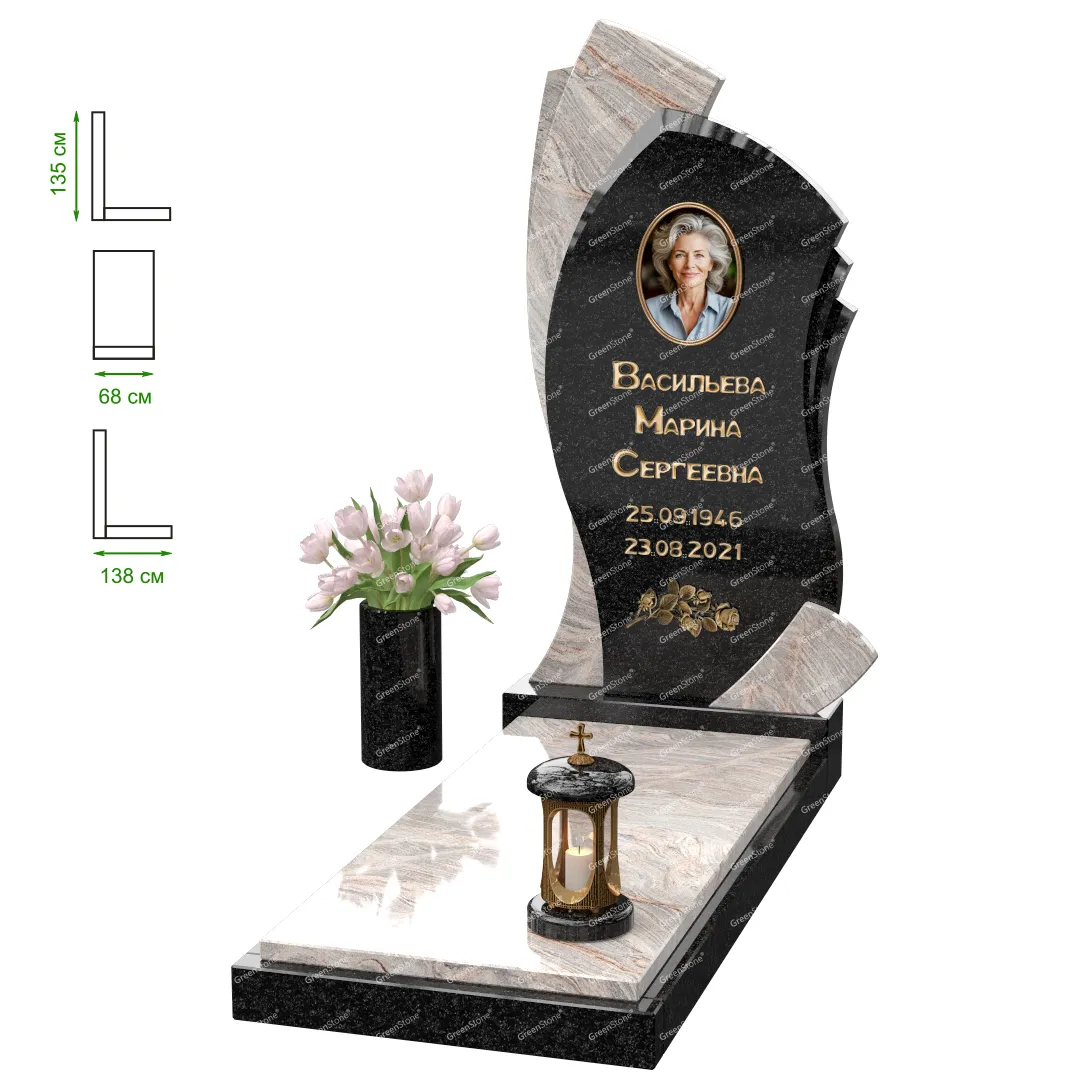Визуально комплекс отличается от типовой формы не только формой, но и размерами. Массивная стела позволяет дизайнеру реализовать практически любые задумки и пожелания Заказчика, придать готовому изделию солидный вид, раскрыть все достоинства использованного в его изготовлении гранита. Такой габаритный памятник требует профессиональной доставки и установки. Все это также можно заказать в мастерской Грин-Стоун.