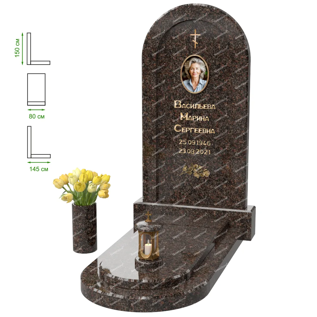 Визуально комплекс отличается от типовой формы не только формой, но и размерами. Массивная стела позволяет дизайнеру реализовать практически любые задумки и пожелания Заказчика, придать готовому изделию солидный вид, раскрыть все достоинства использованного в его изготовлении гранита. Такой габаритный памятник требует профессиональной доставки и установки. Все это также можно заказать в мастерской Грин-Стоун.