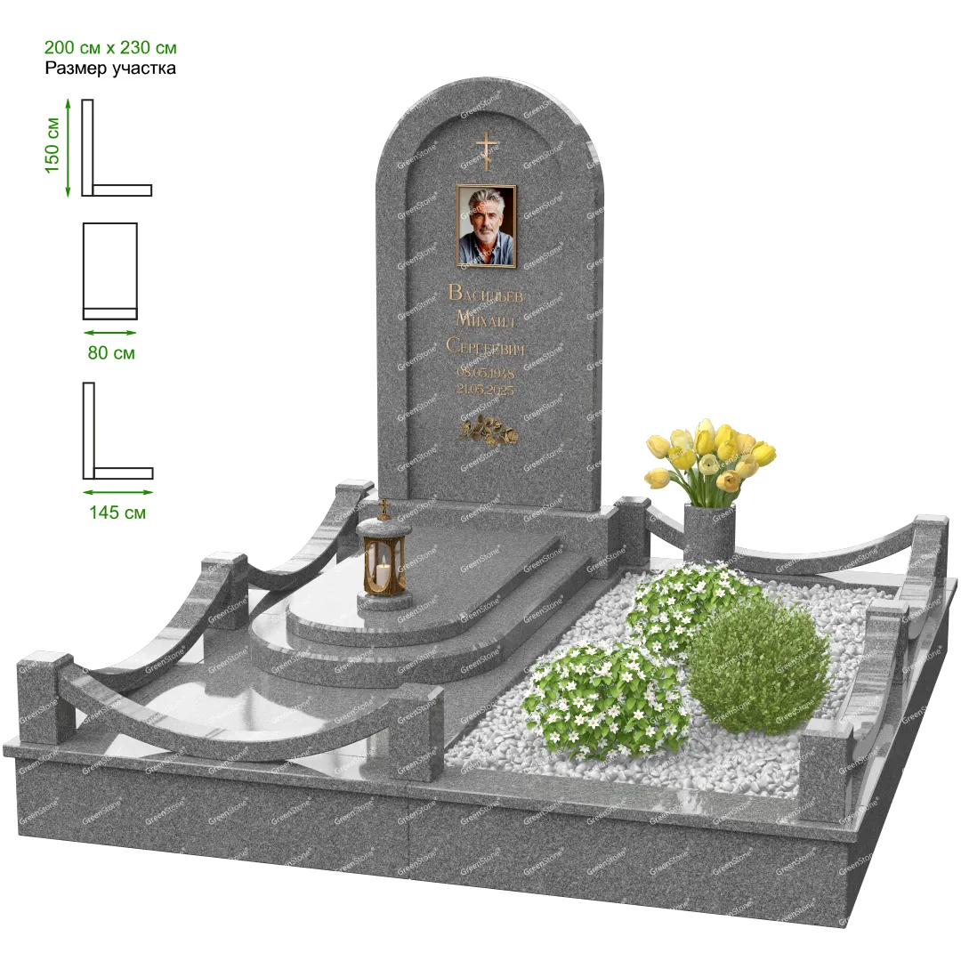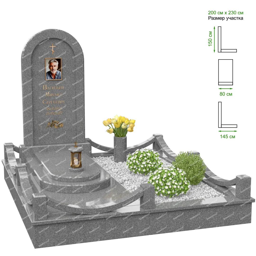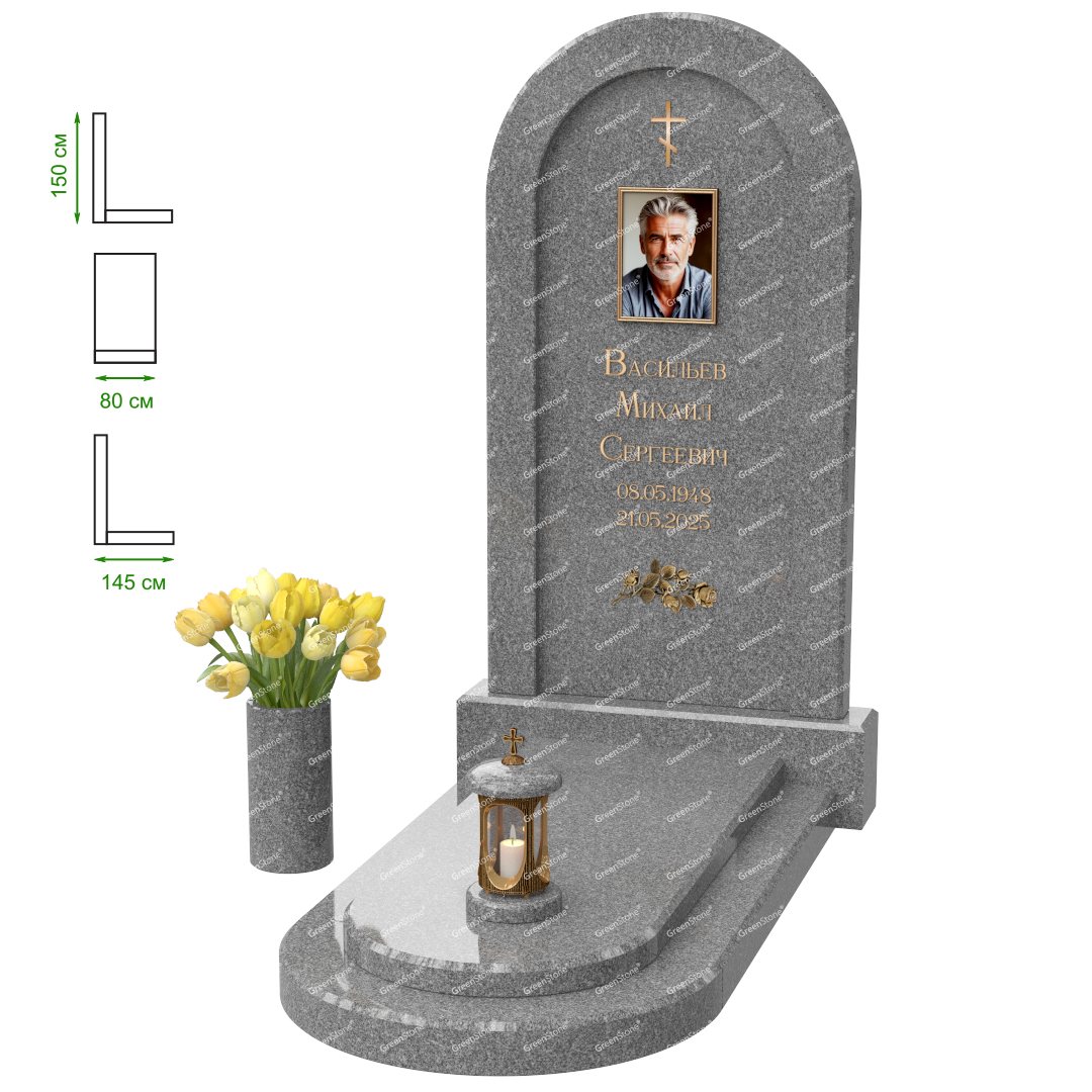 Визуально комплекс отличается от типовой формы не только формой, но и размерами. Массивная стела позволяет дизайнеру реализовать практически любые задумки и пожелания Заказчика, придать готовому изделию солидный вид, раскрыть все достоинства использованного в его изготовлении гранита. Такой габаритный памятник требует профессиональной доставки и установки. Все это также можно заказать в мастерской Грин-Стоун.