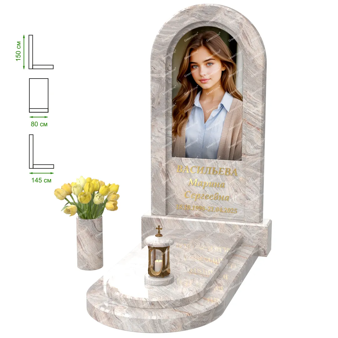 Визуально комплекс отличается от типовой формы не только формой, но и размерами. Массивная стела позволяет дизайнеру реализовать практически любые задумки и пожелания Заказчика, придать готовому изделию солидный вид, раскрыть все достоинства использованного в его изготовлении гранита. Такой габаритный памятник требует профессиональной доставки и установки. Все это также можно заказать в мастерской Грин-Стоун.