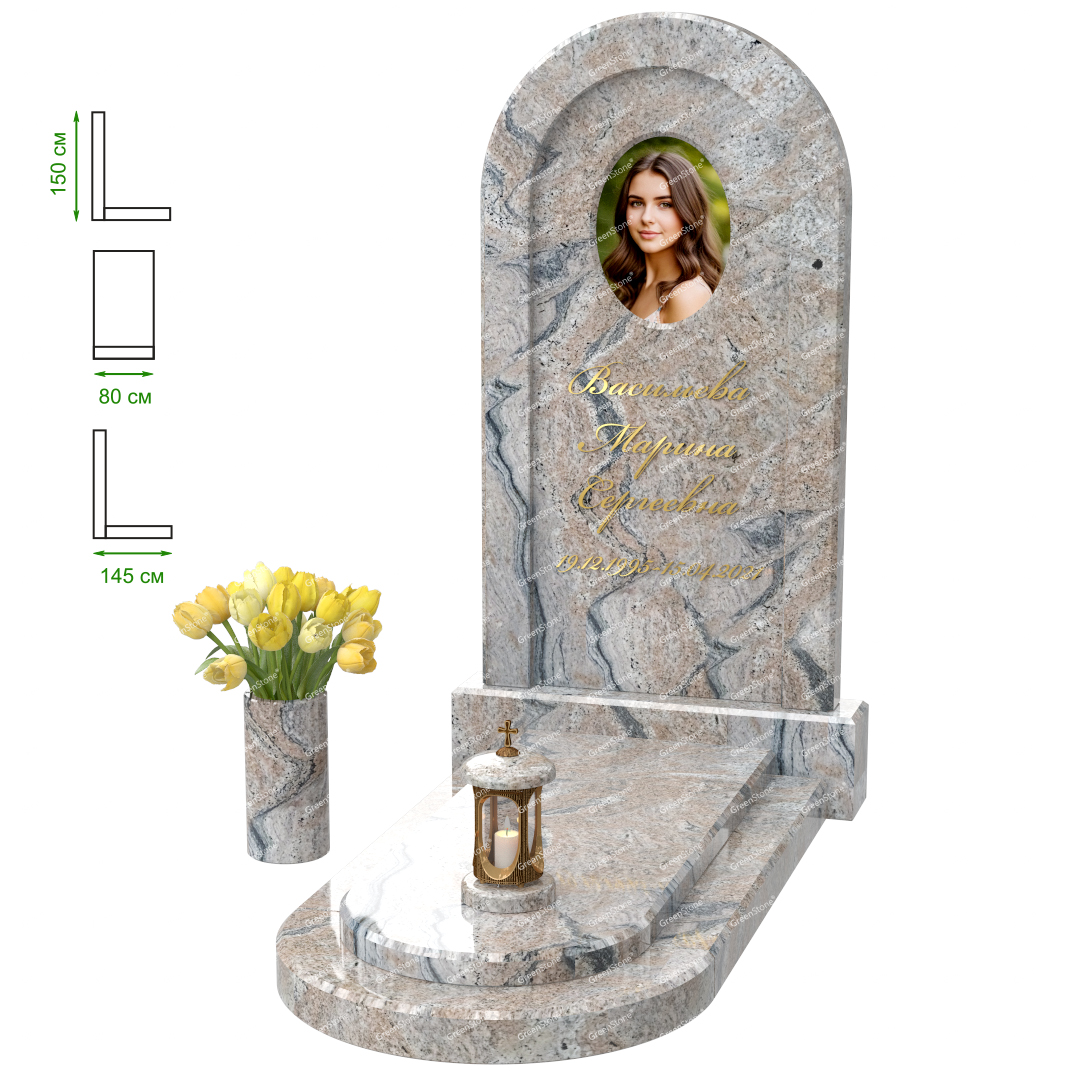 Визуально комплекс отличается от типовой формы не только формой, но и размерами. Массивная стела позволяет дизайнеру реализовать практически любые задумки и пожелания Заказчика, придать готовому изделию солидный вид, раскрыть все достоинства использованного в его изготовлении гранита. Такой габаритный памятник требует профессиональной доставки и установки. Все это также можно заказать в мастерской Грин-Стоун.