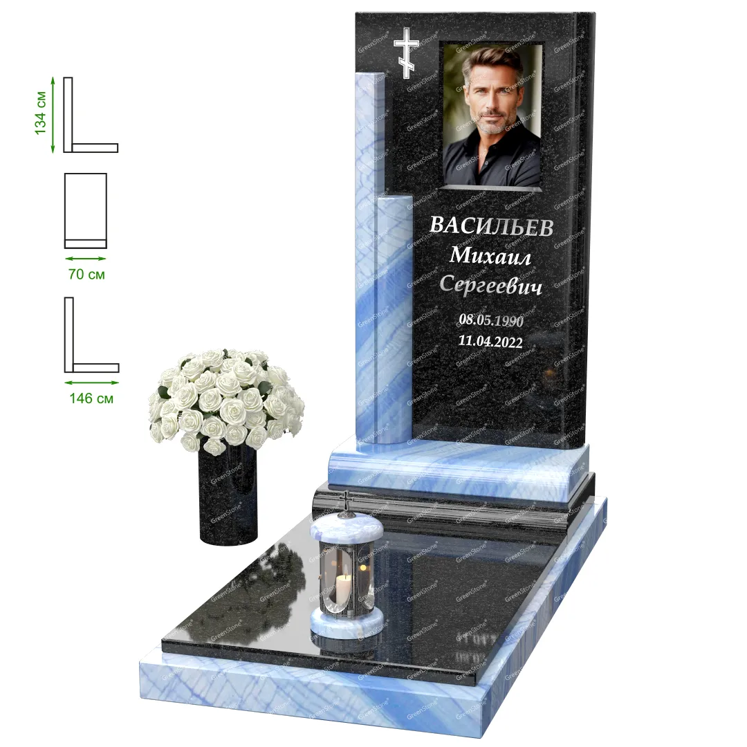 Визуально комплекс отличается от типовой формы не только формой, но и размерами. Массивная стела позволяет дизайнеру реализовать практически любые задумки и пожелания Заказчика, придать готовому изделию солидный вид, раскрыть все достоинства использованного в его изготовлении гранита. Такой габаритный памятник требует профессиональной доставки и установки. Все это также можно заказать в мастерской Грин-Стоун.