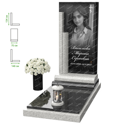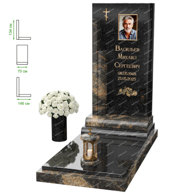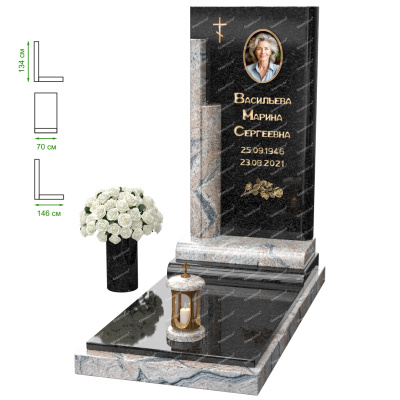 Визуально комплекс отличается от типовой формы не только формой, но и размерами. Массивная стела позволяет дизайнеру реализовать практически любые задумки и пожелания Заказчика, придать готовому изделию солидный вид, раскрыть все достоинства использованного в его изготовлении гранита. Такой габаритный памятник требует профессиональной доставки и установки. Все это также можно заказать в мастерской Грин-Стоун.