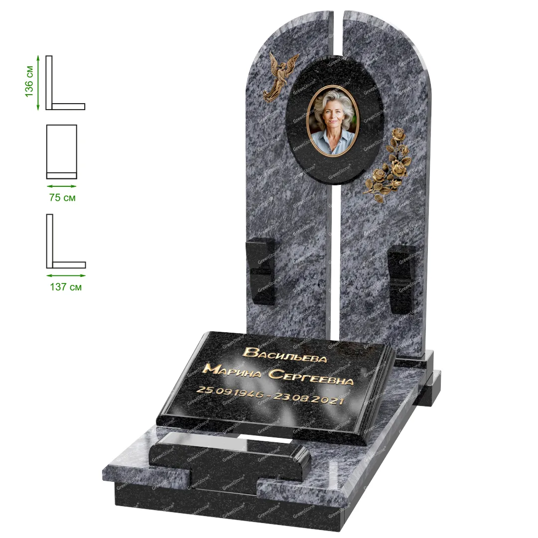 Визуально комплекс отличается от типовой формы не только формой, но и размерами. Массивная стела позволяет дизайнеру реализовать практически любые задумки и пожелания Заказчика, придать готовому изделию солидный вид, раскрыть все достоинства использованного в его изготовлении гранита. Такой габаритный памятник требует профессиональной доставки и установки. Все это также можно заказать в мастерской Грин-Стоун.