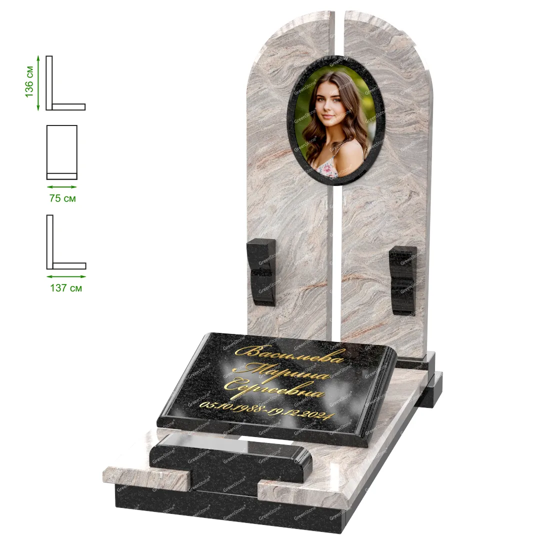 Визуально комплекс отличается от типовой формы не только формой, но и размерами. Массивная стела позволяет дизайнеру реализовать практически любые задумки и пожелания Заказчика, придать готовому изделию солидный вид, раскрыть все достоинства использованного в его изготовлении гранита. Такой габаритный памятник требует профессиональной доставки и установки. Все это также можно заказать в мастерской Грин-Стоун.