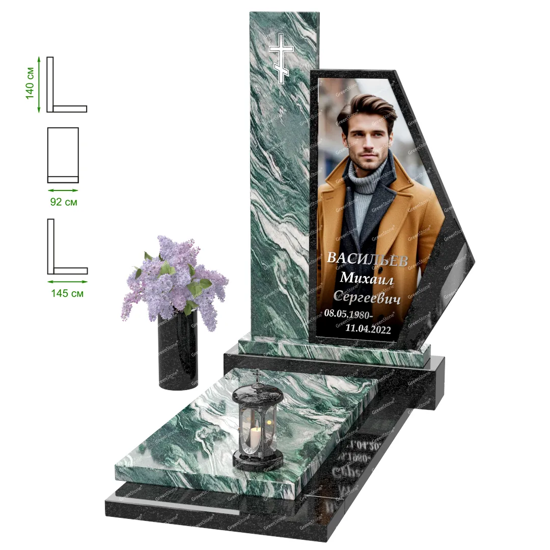 Визуально комплекс отличается от типовой формы не только формой, но и размерами. Массивная стела позволяет дизайнеру реализовать практически любые задумки и пожелания Заказчика, придать готовому изделию солидный вид, раскрыть все достоинства использованного в его изготовлении гранита. Такой габаритный памятник требует профессиональной доставки и установки. Все это также можно заказать в мастерской Грин-Стоун.