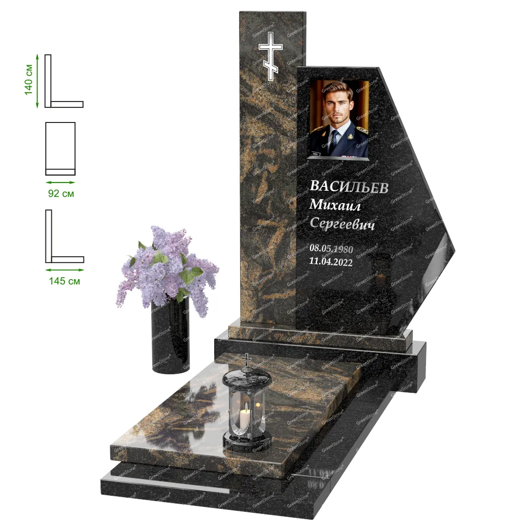 Визуально комплекс отличается от типовой формы не только формой, но и размерами. Массивная стела позволяет дизайнеру реализовать практически любые задумки и пожелания Заказчика, придать готовому изделию солидный вид, раскрыть все достоинства использованного в его изготовлении гранита. Такой габаритный памятник требует профессиональной доставки и установки. Все это также можно заказать в мастерской Грин-Стоун.