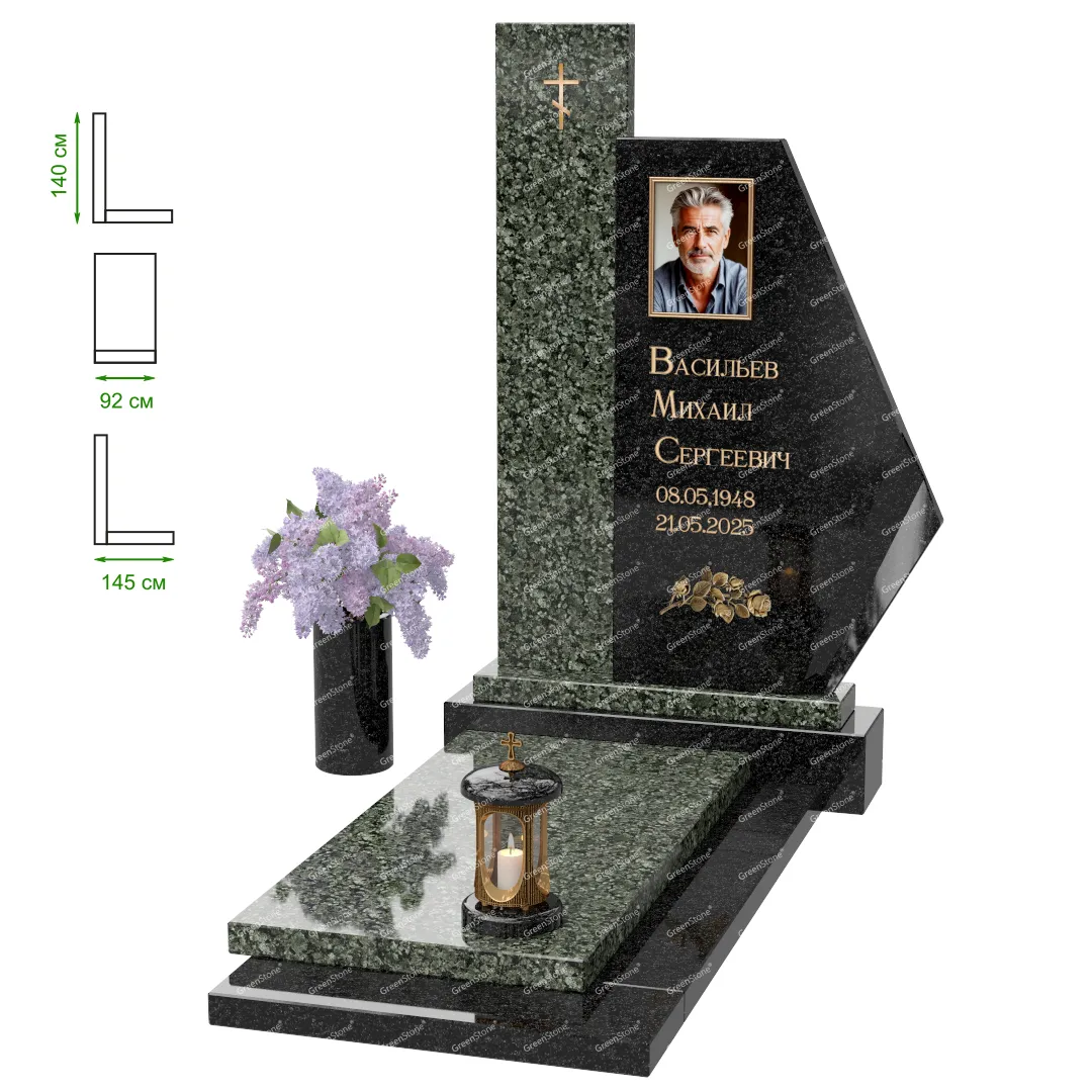 Визуально комплекс отличается от типовой формы не только формой, но и размерами. Массивная стела позволяет дизайнеру реализовать практически любые задумки и пожелания Заказчика, придать готовому изделию солидный вид, раскрыть все достоинства использованного в его изготовлении гранита. Такой габаритный памятник требует профессиональной доставки и установки. Все это также можно заказать в мастерской Грин-Стоун.
